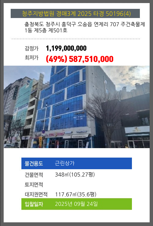 사건번호 2025 타경 50196(4) 본건은 충청북도 청주시 흥덕구 오송읍 연제리 707 주건축물제1동 제5층 제501호소재하는 근린상가경매 물건의 포스팅입니다. 건물면적 [ 348㎡ (105.27평) ]대지권 [ 117.67㎡ (35.6평)