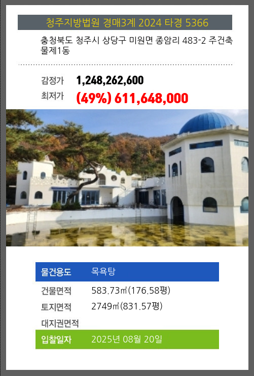 사건번호 2024 타경 5366 본건은 충청북도 청주시 상당구 미원면 종암리 483-2 주건축물제1동소재하는 목욕탕경매 물건의 포스팅입니다. 건물면적 [ 583.73㎡ (176.58평) ]토지면적 [ 2749㎡ (831.57평) ] 시세를