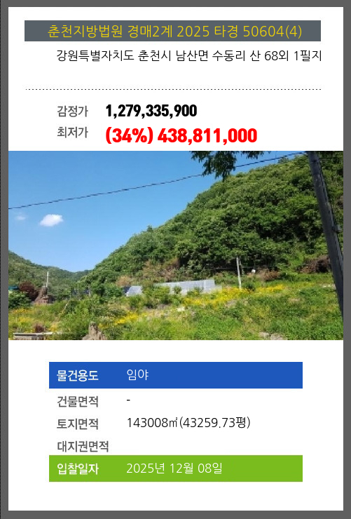 사건번호 2025 타경 50604(4) 본건은 강원특별자치도 춘천시 남산면 수동리 산 68외 1필지소재하는 임야경매 물건의 포스팅입니다. 토지면적 [ 143008㎡ (43259.73평) ] 시세를 반영한 감정가 1,279,335,900에서3회 유찰되어