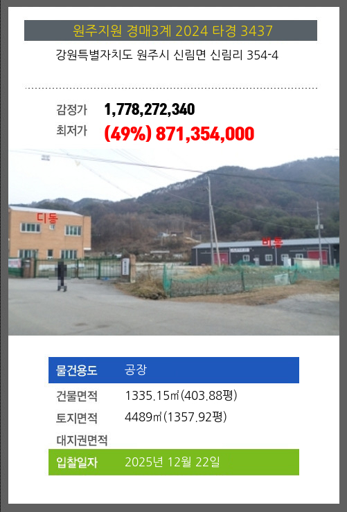 사건번호 2024 타경 3437 본건은 강원특별자치도 원주시 신림면 신림리 354-4소재하는 공장경매 물건의 포스팅입니다. 건물면적 [ 1335.15㎡ (403.88평) ]토지면적 [ 4489㎡ (1357.92평) ] 시세를 반영한 감정가