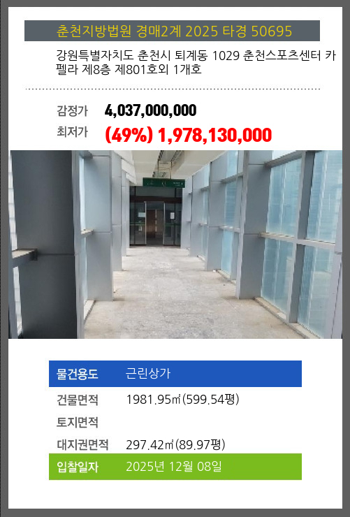 사건번호 2025 타경 50695 본건은 강원특별자치도 춘천시 퇴계동 1029 춘천스포츠센터 카펠라 제8층 제801호외 1개호소재하는 근린상가경매 물건의 포스팅입니다. 건물면적 [ 1981.95㎡ (599.54평) ]대지권 [ 297.42㎡ (89.97평)