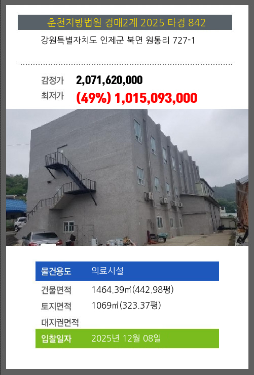 사건번호 2025 타경 842 본건은 강원특별자치도 인제군 북면 원통리 727-1소재하는 의료시설경매 물건의 포스팅입니다. 건물면적 [ 1464.39㎡ (442.98평) ]토지면적 [ 1069㎡ (323.37평) ] 시세를 반영한 감정가