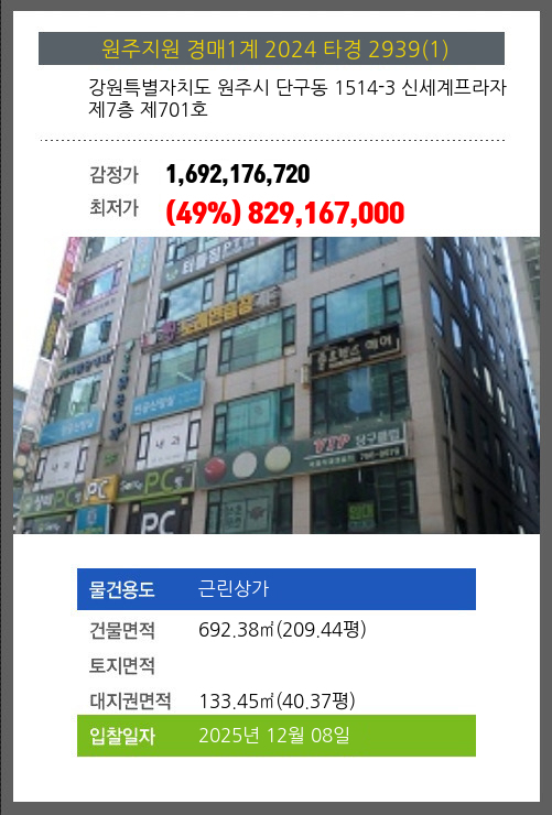 사건번호 2024 타경 2939(1) 본건은 강원특별자치도 원주시 단구동 1514-3 신세계프라자 제7층 제701호소재하는 근린상가경매 물건의 포스팅입니다. 건물면적 [ 692.38㎡ (209.44평) ]대지권 [ 133.45㎡ (40.37평) ] 시세를