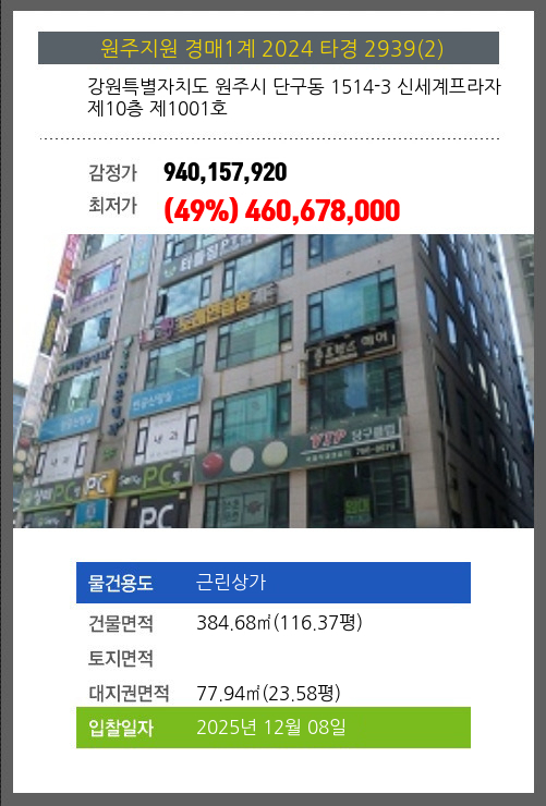 사건번호 2024 타경 2939(2) 본건은 강원특별자치도 원주시 단구동 1514-3 신세계프라자 제10층 제1001호소재하는 근린상가경매 물건의 포스팅입니다. 건물면적 [ 384.68㎡ (116.37평) ]대지권 [ 77.94㎡ (23.58평) ] 시세를