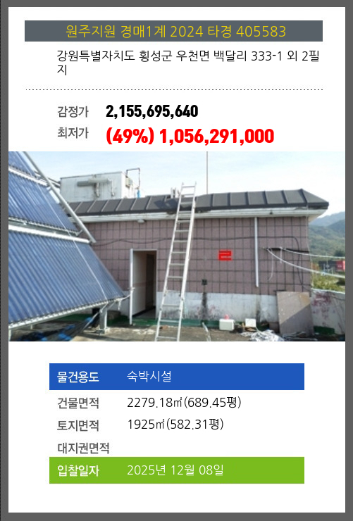 사건번호 2024 타경 405583 본건은 강원특별자치도 횡성군 우천면 백달리 333-1 외 2필지소재하는 숙박시설경매 물건의 포스팅입니다. 건물면적 [ 2279.18㎡ (689.45평) ]토지면적 [ 1925㎡ (582.31평) ] 시세를