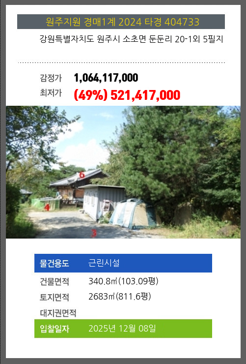 사건번호 2024 타경 404733 본건은 강원특별자치도 원주시 소초면 둔둔리 20-1외 5필지소재하는 근린시설경매 물건의 포스팅입니다. 건물면적 [ 340.8㎡ (103.09평) ]토지면적 [ 2683㎡ (811.6평) ] 시세를 반영한