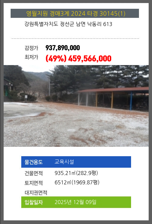 사건번호 2024 타경 30145(1) 본건은 강원특별자치도 정선군 남면 낙동리 613소재하는 교육시설경매 물건의 포스팅입니다. 건물면적 [ 935.21㎡ (282.9평) ]토지면적 [ 6512㎡ (1969.87평) ] 시세를 반영한 감정가
