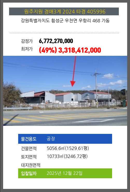 사건번호 2024 타경 405996 본건은 강원특별자치도 횡성군 우천면 우항리 468 가동소재하는 공장경매 물건의 포스팅입니다. 건물면적 [ 5056.6㎡ (1529.61평) ]토지면적 [ 10733㎡ (3246.72평) ] 시세를 반영한