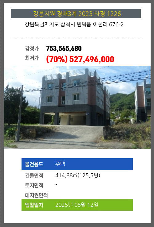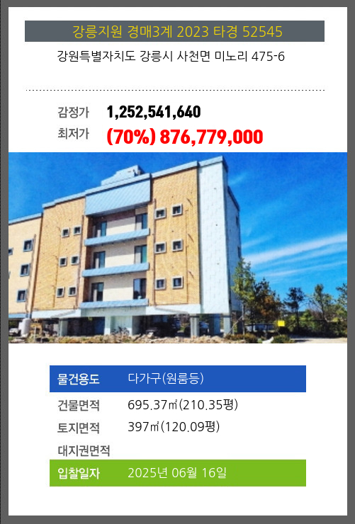 사건번호 2023 타경 52545 본건은 강원특별자치도 강릉시 사천면 미노리 475-6소재하는 다가구(원룸등)경매 물건의 포스팅입니다. 건물면적 [ 695.37㎡ (210.35평) ]토지면적 [ 397㎡ (120.09평) ] 시세를 반영한 감정가