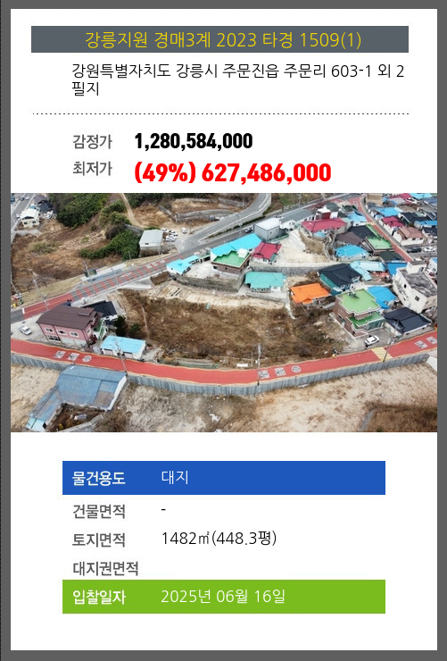 사건번호 2023 타경 1509(1) 본건은 강원특별자치도 강릉시 주문진읍 주문리 603-1 외 2필지소재하는 대지경매 물건의 포스팅입니다. 토지면적 [ 1482㎡ (448.3평) ] 시세를 반영한 감정가 1,280,584,000에서2회 유찰되어