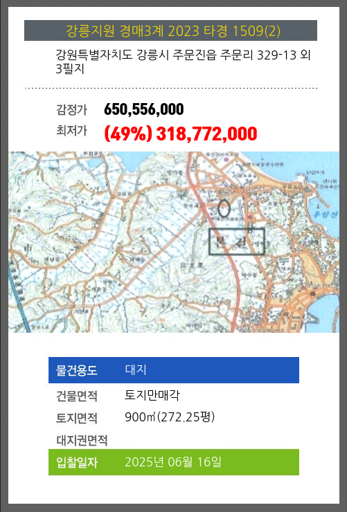 사건번호 2023 타경 1509(2) 본건은 강원특별자치도 강릉시 주문진읍 주문리 329-13 외 3필지소재하는 대지경매 물건의 포스팅입니다. 건물면적 [ 토지만매각 ]토지면적 [ 900㎡ (272.25평) ] 시세를 반영한