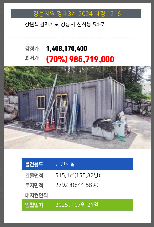 사건번호 2024 타경 1216 본건은 강원특별자치도 강릉시 신석동 54-7소재하는 근린시설경매 물건의 포스팅입니다. 건물면적 [ 515.1㎡ (155.82평) ]토지면적 [ 2792㎡ (844.58평) ] 시세를 반영한 감정가 1,408,170,400에서1회