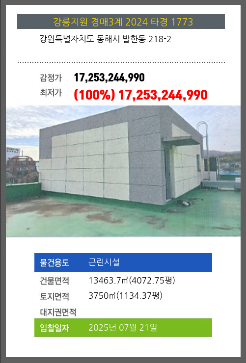 사건번호 2024 타경 1773 본건은 강원특별자치도 동해시 발한동 218-2소재하는 근린시설경매 물건의 포스팅입니다. 건물면적 [ 13463.7㎡ (4072.75평) ]토지면적 [ 3750㎡ (1134.37평) ] 시세를 반영한 감정가 17,253,244,990에서신건으로