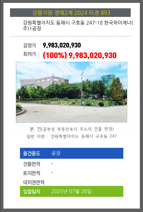 사건번호 2024 타경 893 본건은 강원특별자치도 동해시 구호동 247-18 한국하이제너(주)1공장소재하는 공장경매 물건의 포스팅입니다. 시세를 반영한 감정가 9,983,020,930에서신건으로 감정가 대비 100%최저가 9,983,020,930부터입찰에 참여할 수 있습니다. 입찰보증금은