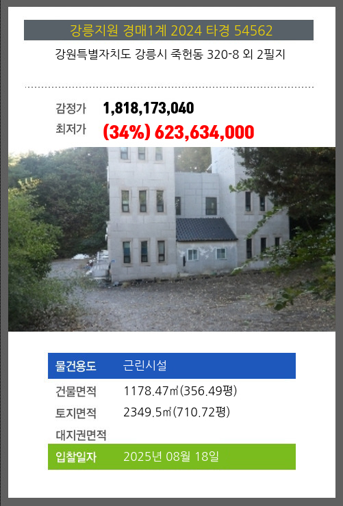 사건번호 2024 타경 54562 본건은 강원특별자치도 강릉시 죽헌동 320-8 외 2필지소재하는 근린시설경매 물건의 포스팅입니다. 건물면적 [ 1178.47㎡ (356.49평) ]토지면적 [ 2349.5㎡ (710.72평) ] 시세를 반영한