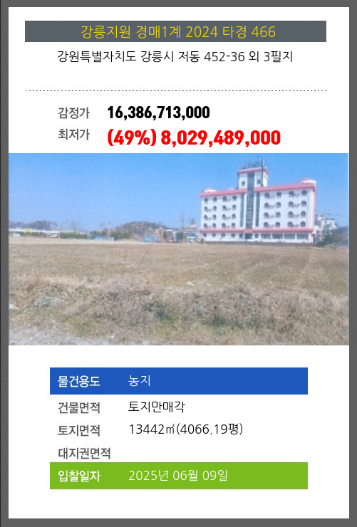 사건번호 2024 타경 466 본건은 강원특별자치도 강릉시 저동 452-36 외 3필지소재하는 농지경매 물건의 포스팅입니다. 건물면적 [ 토지만매각 ]토지면적 [ 13442㎡ (4066.19평) ] 시세를 반영한 감정가