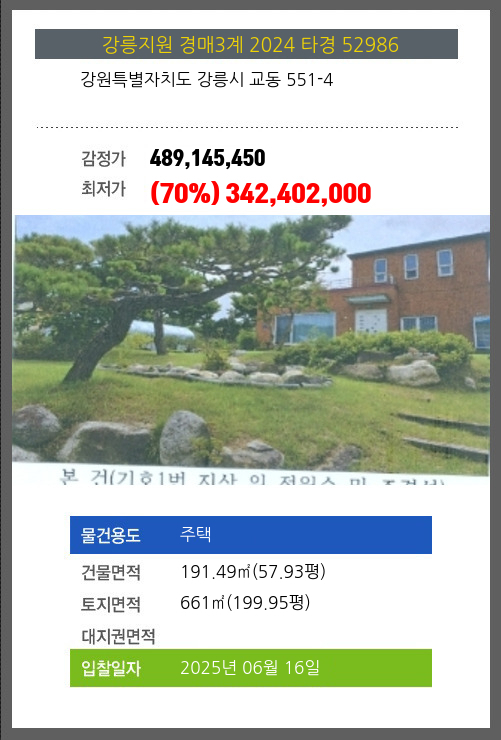 사건번호 2024 타경 52986 본건은 강원특별자치도 강릉시 교동 551-4소재하는 주택경매 물건의 포스팅입니다. 건물면적 [ 191.49㎡ (57.93평) ]토지면적 [ 661㎡ (199.95평) ] 시세를 반영한 감정가 489,145,450에서1회