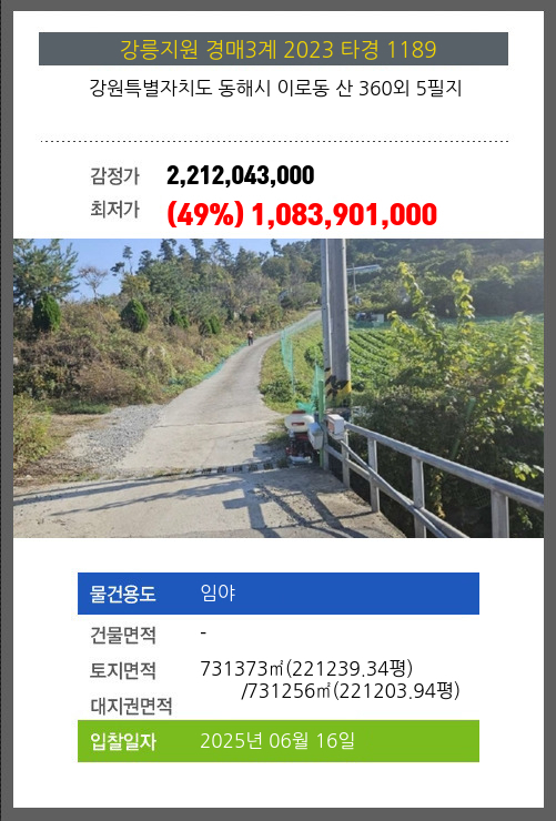 사건번호 2023 타경 1189 본건은 강원특별자치도 동해시 이로동 산 360외 5필지소재하는 임야경매 물건의 포스팅입니다. 토지면적 [ 전체:731373㎡ (221239.34평) 매각지분:731256㎡ (221203.94평) ] 시세를 반영한 감정가 2,212,043,000에서2회