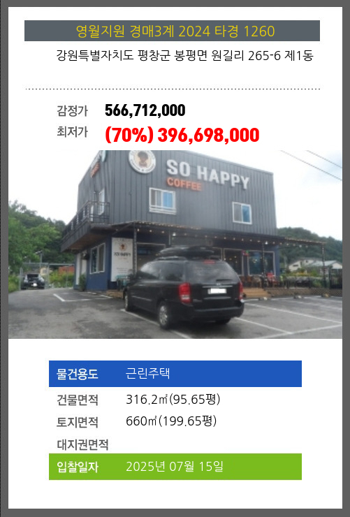 사건번호 2024 타경 1260 본건은 강원특별자치도 평창군 봉평면 원길리 265-6 제1동소재하는 근린주택경매 물건의 포스팅입니다. 건물면적 [ 316.2㎡ (95.65평) ]토지면적 [ 660㎡ (199.65평) ] 시세를 반영한