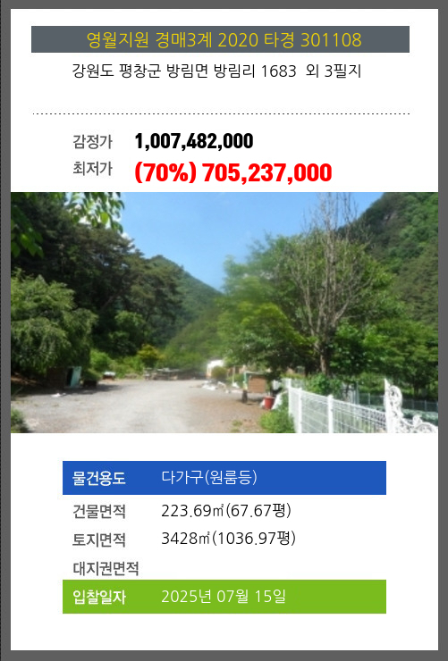 사건번호 2020 타경 301108 본건은 강원도 평창군 방림면 방림리 1683 외 3필지소재하는 다가구(원룸등)경매 물건의 포스팅입니다. 건물면적 [ 223.69㎡ (67.67평) ]토지면적 [ 3428㎡ (1036.97평) ] 시세를