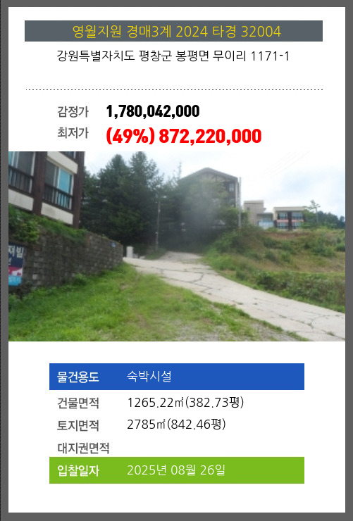 사건번호 2024 타경 32004 본건은 강원특별자치도 평창군 봉평면 무이리 1171-1소재하는 숙박시설경매 물건의 포스팅입니다. 건물면적 [ 1265.22㎡ (382.73평) ]토지면적 [ 2785㎡ (842.46평) ] 시세를 반영한 감정가