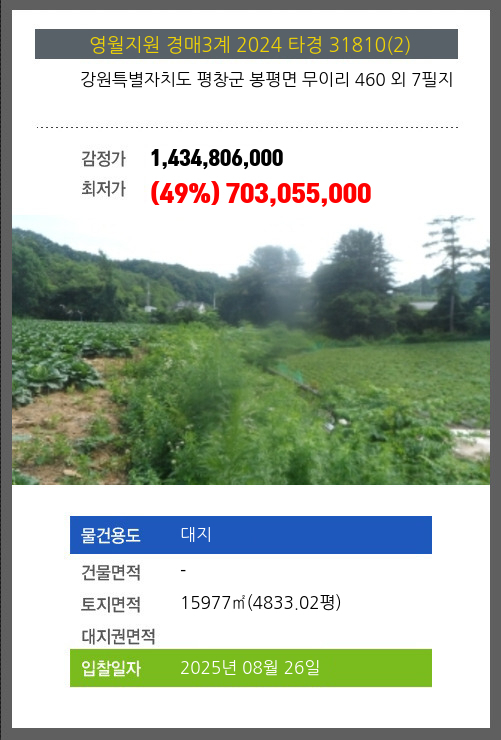 사건번호 2024 타경 31810(2) 본건은 강원특별자치도 평창군 봉평면 무이리 460 외 7필지소재하는 대지경매 물건의 포스팅입니다. 토지면적 [ 15977㎡ (4833.02평) ] 시세를 반영한 감정가 1,434,806,000에서2회 유찰되어