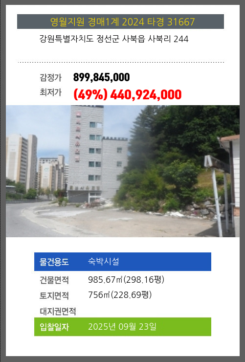 사건번호 2024 타경 31667 본건은 강원특별자치도 정선군 사북읍 사북리 244소재하는 숙박시설경매 물건의 포스팅입니다. 건물면적 [ 985.67㎡ (298.16평) ]토지면적 [ 756㎡ (228.69평) ] 시세를 반영한 감정가