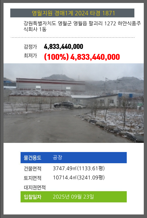 사건번호 2024 타경 1871 본건은 강원특별자치도 영월군 영월읍 팔괴리 1272 하얀식품주식회사 1동소재하는 공장경매 물건의 포스팅입니다. 건물면적 [ 3747.49㎡ (1133.61평) ]토지면적 [ 10714.4㎡ (3241.09평) ] 시세를