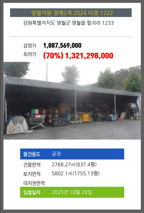 사건번호 2024 타경 1222 본건은 강원특별자치도 영월군 영월읍 팔괴리 1233소재하는 공장경매 물건의 포스팅입니다. 건물면적 [ 2768.27㎡ (837.4평) ]토지면적 [ 5802.1㎡ (1755.13평) ] 시세를 반영한 감정가