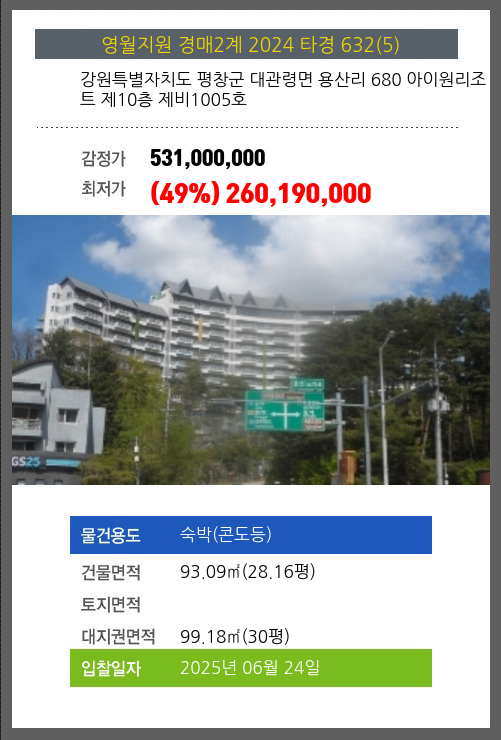 사건번호 2024 타경 632(5) 본건은 강원특별자치도 평창군 대관령면 용산리 680 아이원리조트 제10층 제비1005호소재하는 숙박(콘도등)경매 물건의 포스팅입니다. 건물면적 [ 93.09㎡ (28.16평) ]대지권 [ 99.18㎡ (30평) ]