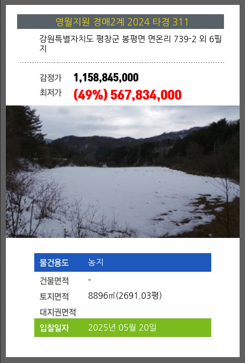 사건번호 2024 타경 311 본건은 강원특별자치도 평창군 봉평면 면온리 739-2 외 6필지소재하는 농지경매 물건의 포스팅입니다. 토지면적 [ 8896㎡ (2691.03평) ] 시세를 반영한 감정가 1,158,845,000에서2회 유찰되어