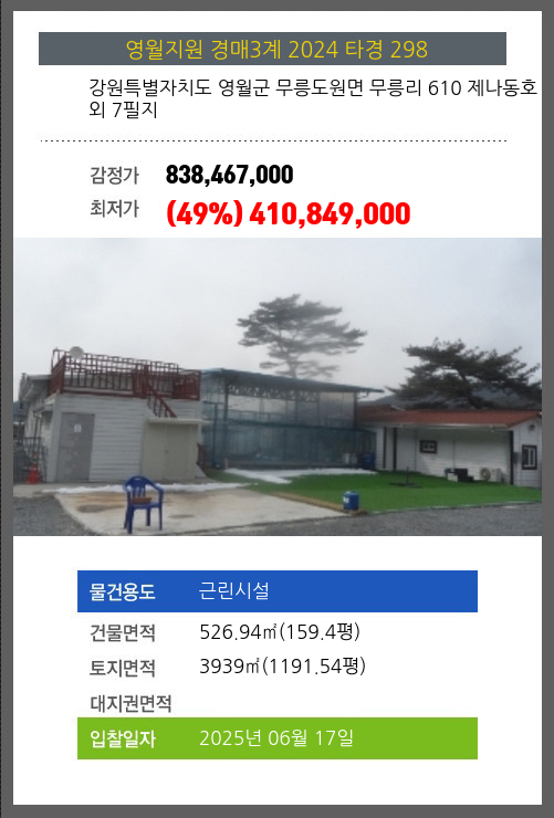 사건번호 2024 타경 298 본건은 강원특별자치도 영월군 무릉도원면 무릉리 610 제나동호외 7필지소재하는 근린시설경매 물건의 포스팅입니다. 건물면적 [ 526.94㎡ (159.4평) ]토지면적 [ 3939㎡ (1191.54평) ] 시세를