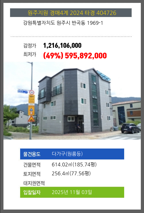 사건번호 2024 타경 404726 본건은 강원특별자치도 원주시 반곡동 1969-1소재하는 다가구(원룸등)경매 물건의 포스팅입니다. 건물면적 [ 614.02㎡ (185.74평) ]토지면적 [ 256.4㎡ (77.56평) ] 시세를 반영한 감정가 1,216,106,000에서2회