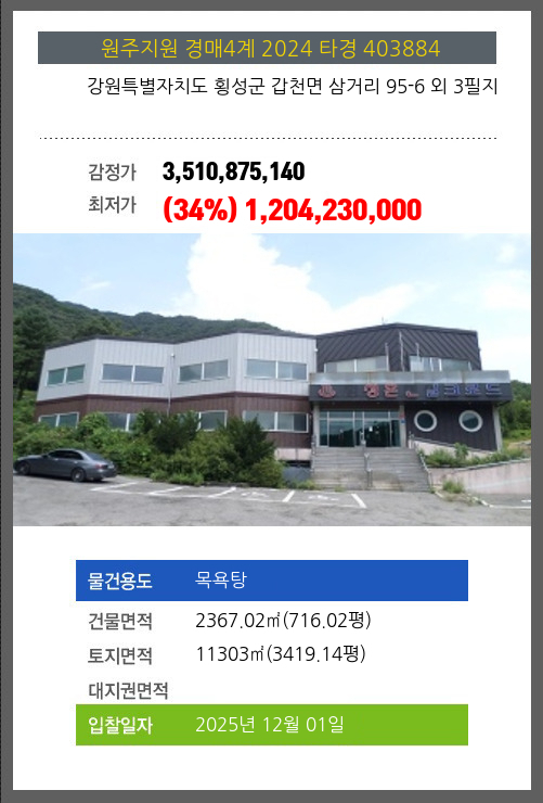 사건번호 2024 타경 403884 본건은 강원특별자치도 횡성군 갑천면 삼거리 95-6 외 3필지소재하는 목욕탕경매 물건의 포스팅입니다. 건물면적 [ 2367.02㎡ (716.02평) ]토지면적 [ 11303㎡ (3419.14평) ] 시세를