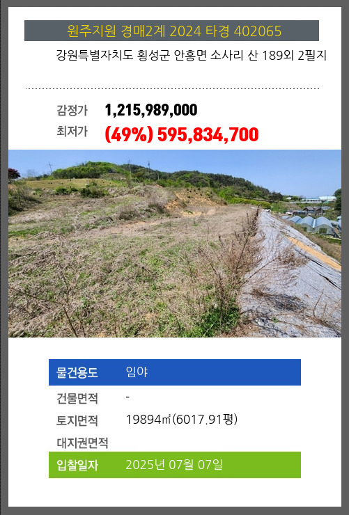 사건번호 2024 타경 402065 본건은 강원특별자치도 횡성군 안흥면 소사리 산 189외 2필지소재하는 임야경매 물건의 포스팅입니다. 토지면적 [ 19894㎡ (6017.91평) ] 시세를 반영한 감정가 1,215,989,000에서2회 유찰되어
