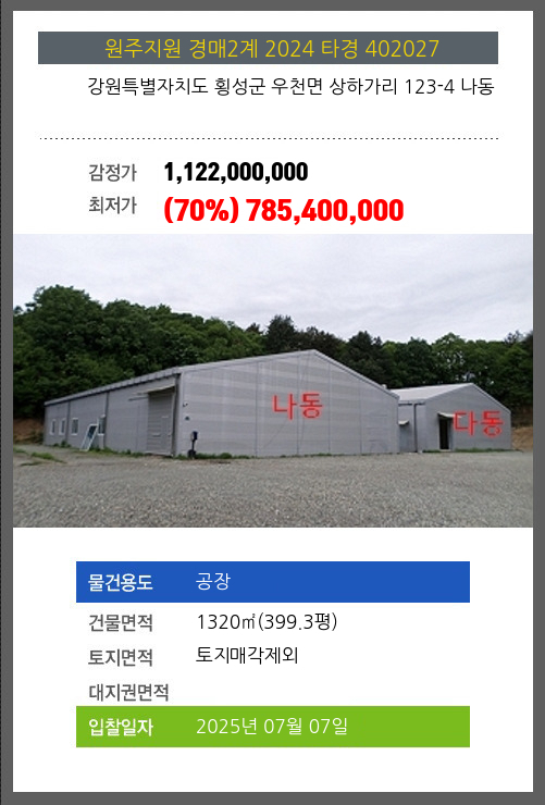 사건번호 2024 타경 402027 본건은 강원특별자치도 횡성군 우천면 상하가리 123-4 나동소재하는 공장경매 물건의 포스팅입니다. 건물면적 [ 1320㎡ (399.3평) ]토지면적 [ 토지 매각제외 ] 시세를 반영한