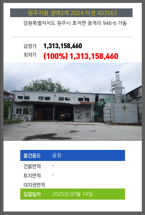 사건번호 2024 타경 403563 본건은 강원특별자치도 원주시 호저면 광격리 946-6 가동소재하는 공장경매 물건의 포스팅입니다. 시세를 반영한 감정가 1,313,158,460에서신건으로 감정가 대비 100%최저가 1,313,158,460부터입찰에 참여할 수 있습니다.