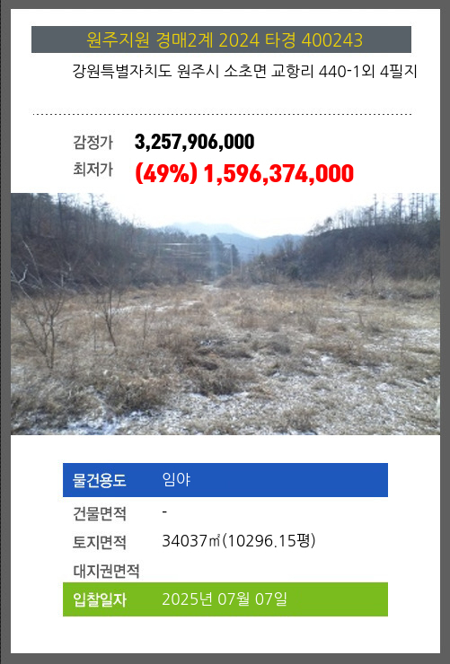 사건번호 2024 타경 400243 본건은 강원특별자치도 원주시 소초면 교항리 440-1외 4필지소재하는 임야경매 물건의 포스팅입니다. 토지면적 [ 34037㎡ (10296.15평) ] 시세를 반영한 감정가 3,257,906,000에서3회 유찰되어 감정가