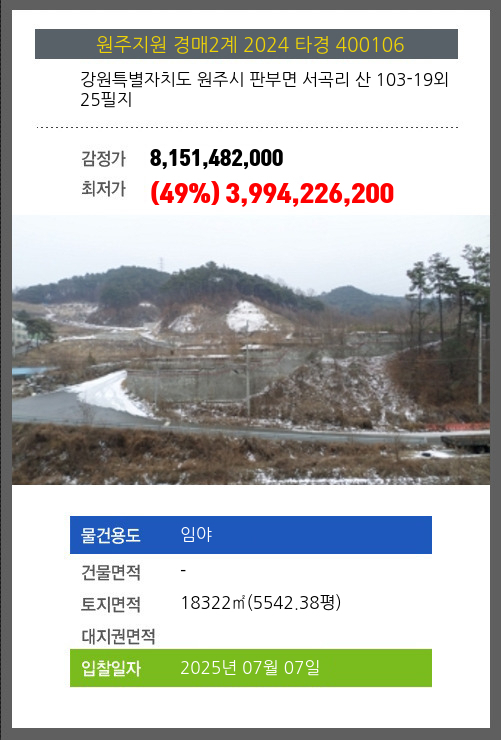 사건번호 2024 타경 400106 본건은 강원특별자치도 원주시 판부면 서곡리 산 103-19외 25필지소재하는 임야경매 물건의 포스팅입니다. 토지면적 [ 18322㎡ (5542.38평) ] 시세를 반영한 감정가 8,151,482,000에서2회 유찰되어