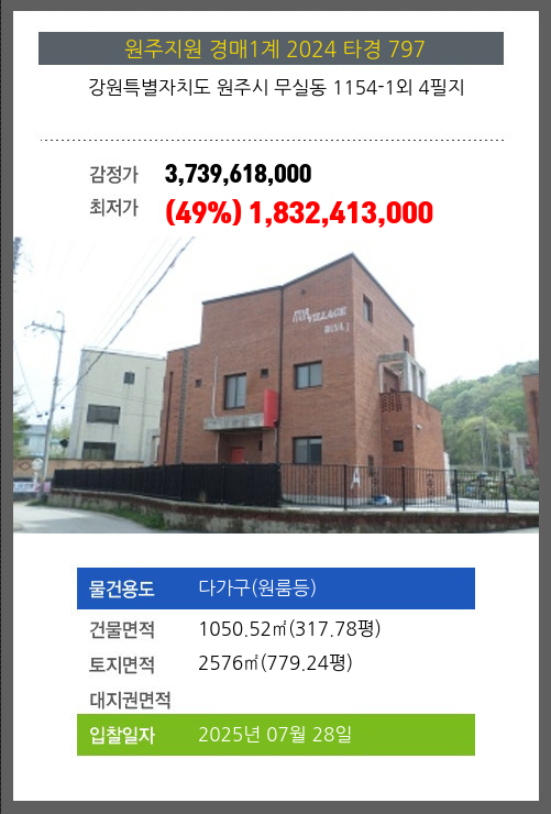 사건번호 2024 타경 797 본건은 강원특별자치도 원주시 무실동 1154-1외 4필지소재하는 다가구(원룸등)경매 물건의 포스팅입니다. 건물면적 [ 1050.52㎡ (317.78평) ]토지면적 [ 2576㎡ (779.24평) ] 시세를 반영한 감정가