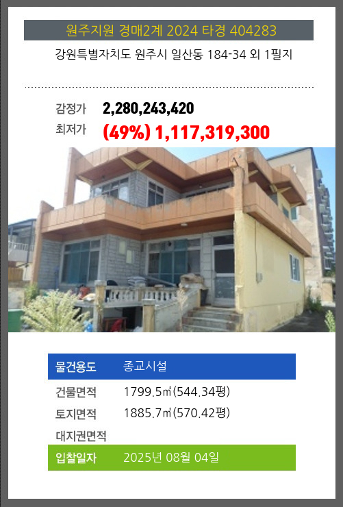사건번호 2024 타경 404283 본건은 강원특별자치도 원주시 일산동 184-34 외 1필지소재하는 종교시설경매 물건의 포스팅입니다. 건물면적 [ 1799.5㎡ (544.34평) ]토지면적 [ 1885.7㎡ (570.42평) ] 시세를 반영한