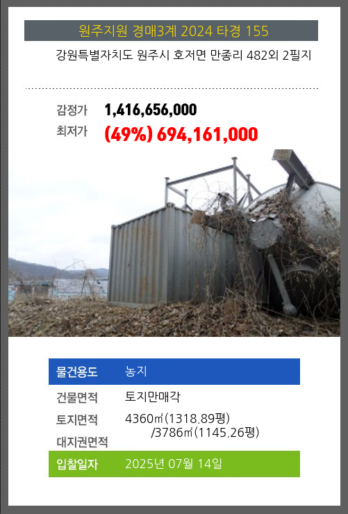 사건번호 2024 타경 155 본건은 강원특별자치도 원주시 호저면 만종리 482외 2필지소재하는 농지경매 물건의 포스팅입니다. 건물면적 [ 토지만매각 ]토지면적 [ 전체:4360㎡ (1318.89평) 매각지분:3786㎡ (1145.26평) ] 시세를