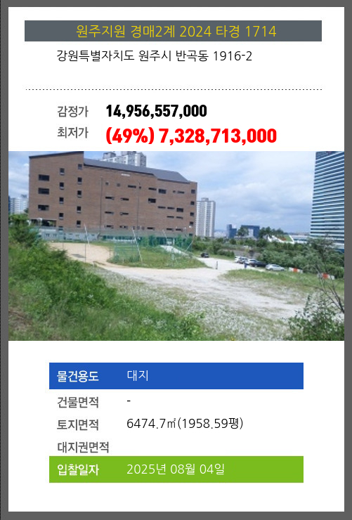 사건번호 2024 타경 1714 본건은 강원특별자치도 원주시 반곡동 1916-2소재하는 대지경매 물건의 포스팅입니다. 토지면적 [ 6474.7㎡ (1958.59평) ] 시세를 반영한 감정가 14,956,557,000에서2회 유찰되어 감정가 대비 49%최저가
