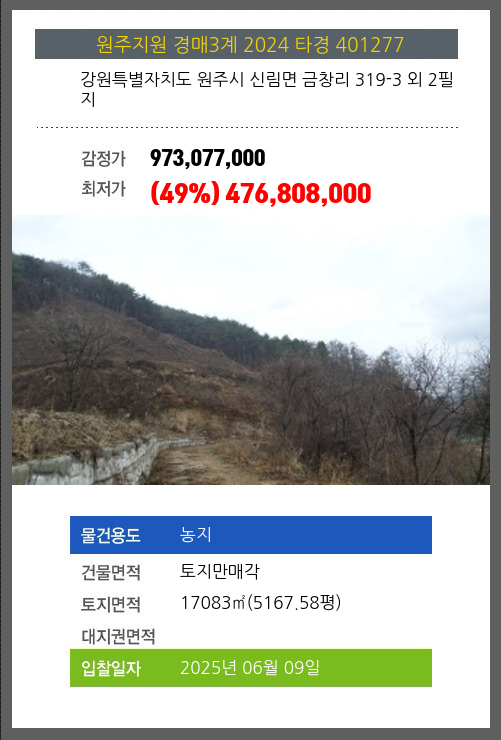 사건번호 2024 타경 401277 본건은 강원특별자치도 원주시 신림면 금창리 319-3 외 2필지소재하는 농지경매 물건의 포스팅입니다. 건물면적 [ 토지만매각 ]토지면적 [ 17083㎡ (5167.58평) ] 시세를 반영한