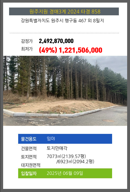 사건번호 2024 타경 858 본건은 강원특별자치도 원주시 행구동 467 외 8필지소재하는 임야경매 물건의 포스팅입니다. 건물면적 [ 토지만매각 ]토지면적 [ 전체:7073㎡ (2139.57평) 매각지분:6923㎡ (2094.2평) ] 시세를