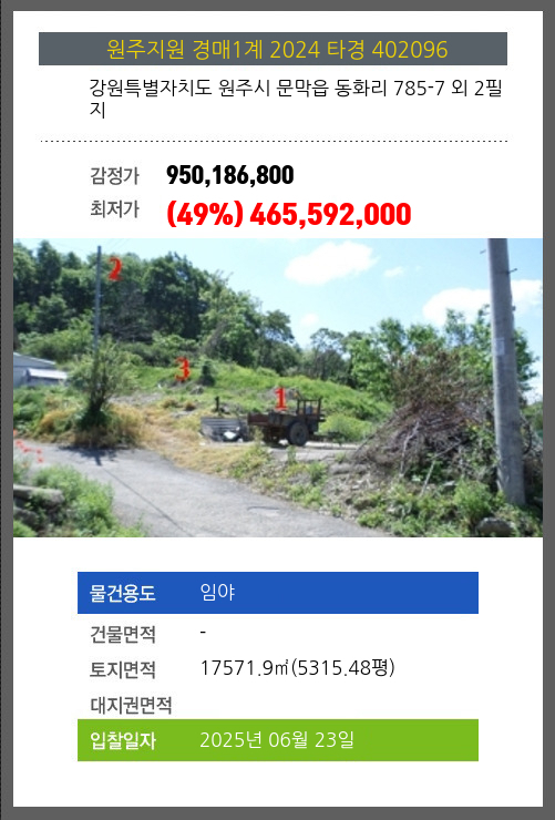 사건번호 2024 타경 402096 본건은 강원특별자치도 원주시 문막읍 동화리 785-7 외 2필지소재하는 임야경매 물건의 포스팅입니다. 토지면적 [ 17571.9㎡ (5315.48평) ] 시세를 반영한 감정가 950,186,800에서2회 유찰되어