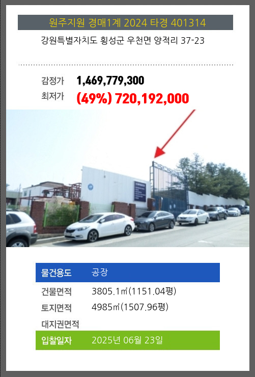 사건번호 2024 타경 401314 본건은 강원특별자치도 횡성군 우천면 양적리 37-23소재하는 공장경매 물건의 포스팅입니다. 건물면적 [ 3805.1㎡ (1151.04평) ]토지면적 [ 4985㎡ (1507.96평) ] 시세를 반영한 감정가