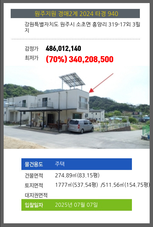 사건번호 2024 타경 940 본건은 강원특별자치도 원주시 소초면 흥양리 319-17외 3필지소재하는 주택경매 물건의 포스팅입니다. 건물면적 [ 274.89㎡ (83.15평) ]토지면적 [ 전체:1777㎡ (537.54평) 매각지분:511.56㎡ (154.75평) ]