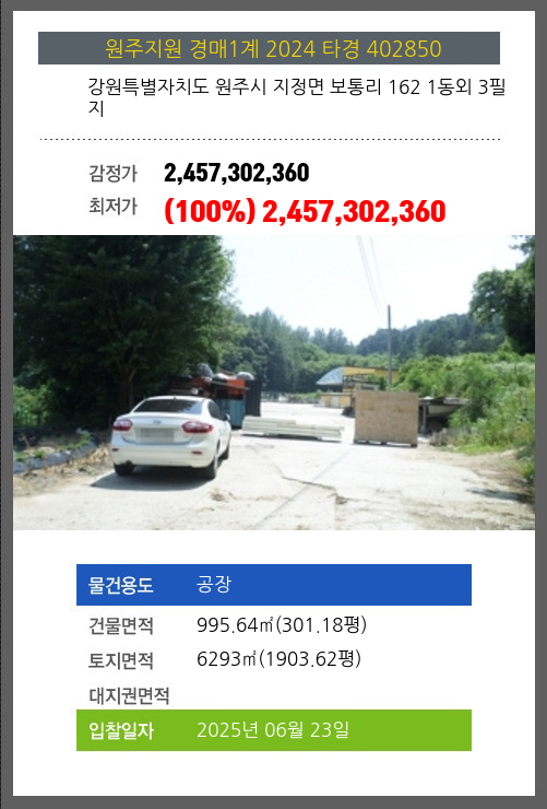사건번호 2024 타경 402850 본건은 강원특별자치도 원주시 지정면 보통리 162 1동외 3필지소재하는 공장경매 물건의 포스팅입니다. 건물면적 [ 995.64㎡ (301.18평) ]토지면적 [ 6293㎡ (1903.62평) ] 시세를