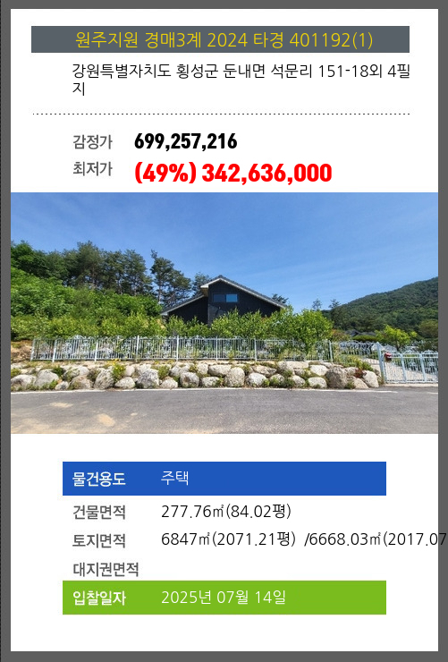 사건번호 2024 타경 401192(1) 본건은 강원특별자치도 횡성군 둔내면 석문리 151-18외 4필지소재하는 주택경매 물건의 포스팅입니다. 건물면적 [ 277.76㎡ (84.02평) ]토지면적 [ 전체:6847㎡ (2071.21평) 매각지분:6668.03㎡ (2017.07평) ]